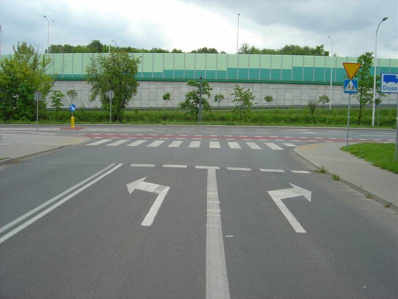 Ponad 10 metrów ma do przejścia pieszy przez te 3 pasy, mimo że ruch samochodów w tym miejscu jest szczątkowy i nie uzasadnia wydzielania dwóch pasów do skrętu (Warszawa, południowy kraniec ul. Kolumbijskiej).