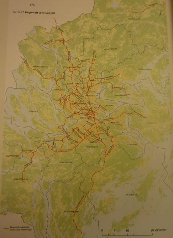 Wracając do tras tylko dla rowerów i patrząc na nieco większą skalę, na zdjęciu widoczny jest fragment regionalnej strategii rozwoju, a konkretnie mapa planowanych tras rowerowych w regionie sztokholmskim oraz połączeń z sąsiednimi. Jak widać, trasy rowerowe mają pełnić funkcje komunikacyjne - łączą miasta i prowadzą z różnych okolic do Sztokholmu.