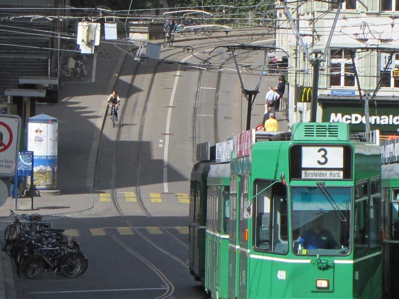 Jeśli uda się trafić na moment, gdy gęsty ruch tramwajowy nie zasłania całego widoku, można uchwycić śmigających po tym ekstremalnie (jak na polskie warunki) stromym torowisku rowerzystów. Tak, tu też mogą.