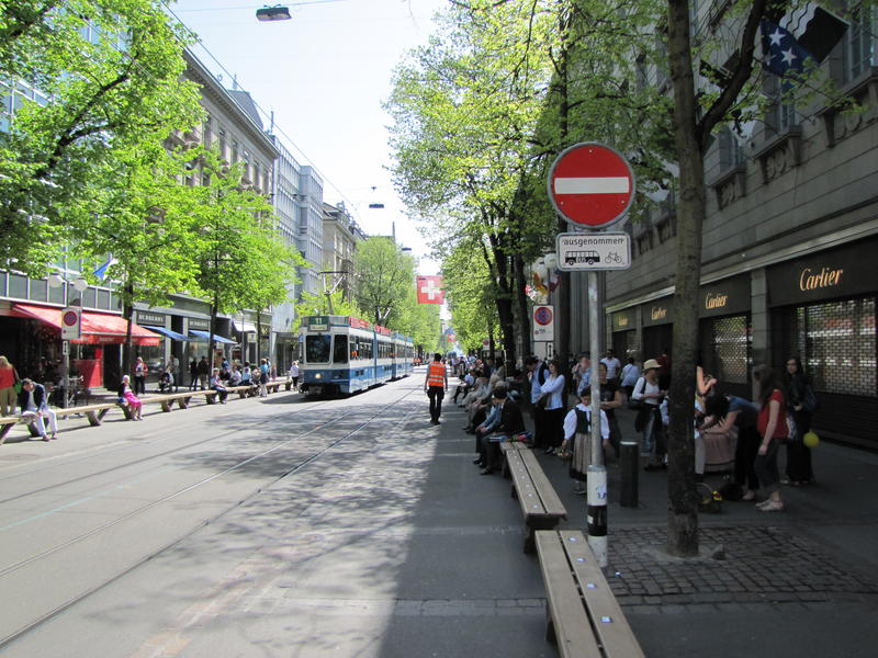 A to już Zurych i Bahnhofstrasse, ulica handlowa prowadząca z głównego dworca kolejowego nad jezioro Zuryskie. Torowisko i chodnik znajdują się na jednym poziomie, piesi łażą jak chcą, a między nimi z błogosławieństwiem lokalnego inżyniera ruchu śmigają rowerzyści. Czy od tego nie załamie się kurs franka?