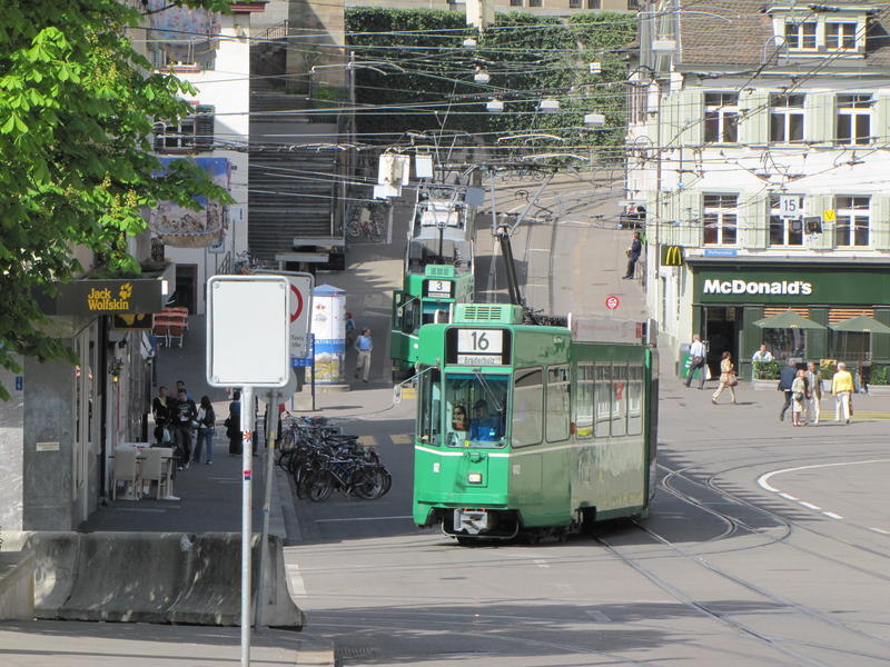 Przenosimy się na drugi brzeg Renu – na zdjęciu widok na Kohlenberg, gdzie tramwaje jeżdżą co chwilę, pokonując przy tym nieliche pochylenie (średnio 7%, w najbardziej stromym miejscu 8,4%).