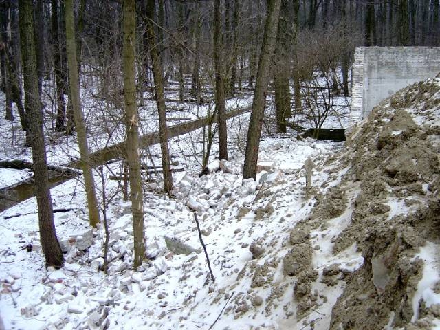 Widok z rumowiska, w tle niezamarzająca rzeczka Rudawka przy której zimą lubi przebywać ptactwo wodne.