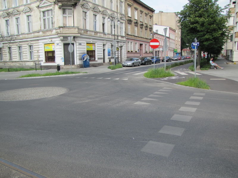 Po przebudowie: w ramach modernizacji sygnalizację zastąpiono minirondem z przejezdną wyspą centralną. Widoczne także włączenie drogi dla rowerów jako dodatkowy wlot ronda - służy ono jadącym Reja na zasadach ogólnych od północy (na zdjęciu - z lewej) i skręcającym w Mickiewicza w stronę centrum ("pod prąd ruchu samochodowego").