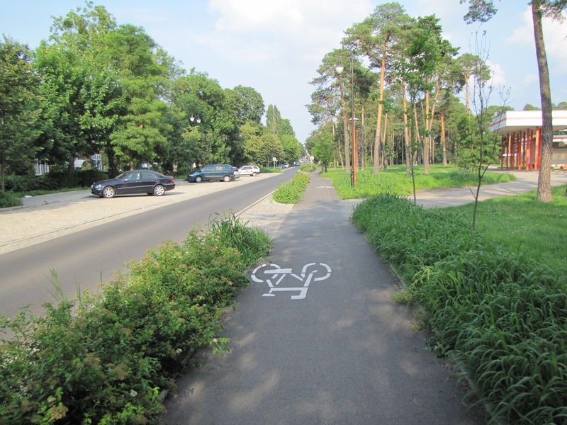 Po przebudowie: końcowy odcinek ulicy. Warto zwrócić uwagę na zachowanie ciągłości drogi dla rowerów na zjeździe publicznym.