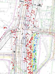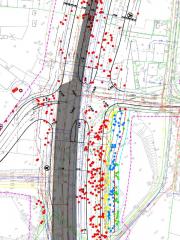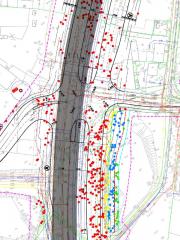 Fragment projektu „budowy linii tramwajowej” na przejściu przez Wydmę Nowodworską. Czerwone kropki to drzewa do usunięcia niezależnie od wariantu; żółte, niebieskie i zielone – drzewa według projektantów możliwe do ocalenia poprzez „optymalizację” projektu (rezygnację ze ścieżki rowerowej, chodnika i wzmocnienia skarpy). Razem ponad 400 drzew do wycinki.