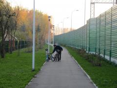 Zemsta projektanta, czyli hopki w rejonie skrzyżowania z ul. Encyklopedyczną. Najpierw zmusiliśmy biedaka do doprojektowania brakujących 800 m ścieżki między Encyklopedyczną a węzłem Młociny. Potem zablokowaliśmy jego inicjatywę urozmaicenia doprojektowanego odcinka trzema ciasnymi łukami o promieniu 2-4 m [zobacz >>>]. No to chociaż wrzuconymi do projektu w ostatnim momencie bez żadnych konsultacji hopkami odegrał się na rowerzystach.