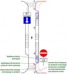 To rysunek 14 z opracowania – ulica jednokierunkowa z dopuszczonym ruchem pod prąd. Rozwiązanie ważne i potrzebne, choć mogłoby być lepsze. Po lewej stronie poprawne parkowanie w zatoce, ale prawa strona jest do korekty.