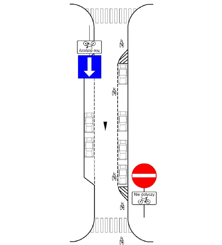 To rysunek 14 z opracowania – ulica jednokierunkowa z dopuszczonym ruchem pod prąd. Rozwiązanie ważne i potrzebne, choć mogłoby być lepsze. Po lewej stronie poprawne parkowanie w zatoce, ale prawa strona jest do korekty.