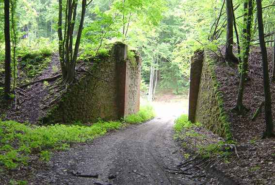 Pozostałości wiaduktu na linii Myślice - Elbląg w lesie na północ od wsi Kwietniewo.
