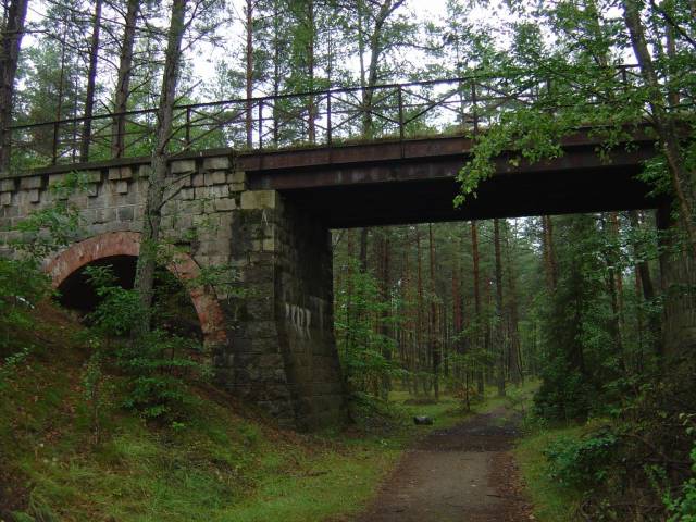 Proste stalowe przęsło przejazdu nad dawnym torowiskiem linii Lębork-Bytów niedaleko wsi Soszyca odstaje trochę od dostojnych kamiennych przyczółków.