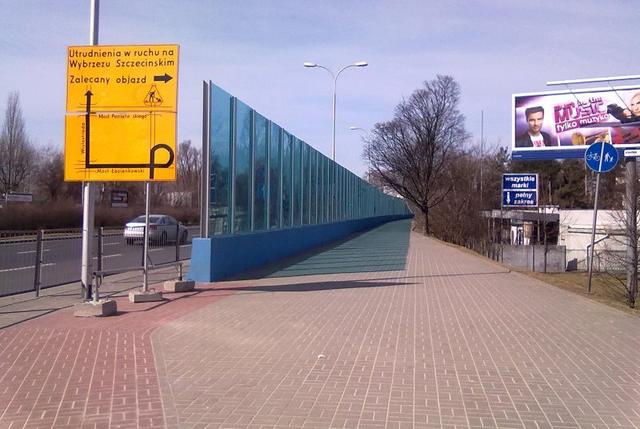 Czerwona nawierzchnia i symbol roweru na niebieskim tle oznaczają według stołecznych inżynierów drogę dla ekranów przeciwhałasowych.