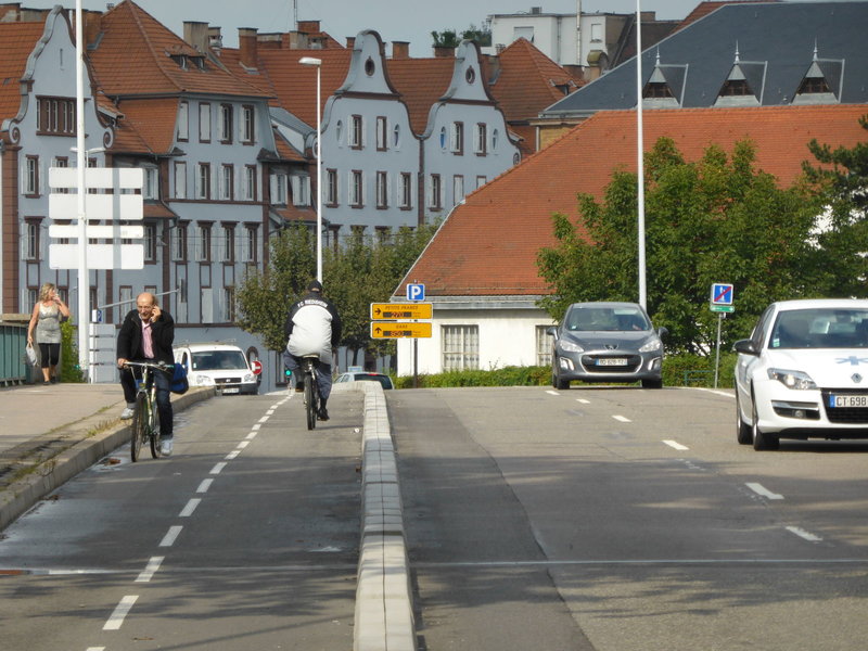 Wygrodzenie drogi dla rowerów z jezdni na moście Pasteura w Strasburgu (Francja).