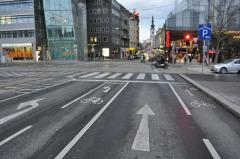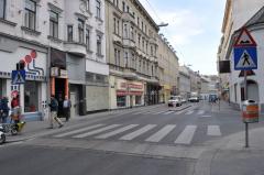 Wiedeń nie boi się uspokojenia ruchu metodami fizycznymi. Na zdjęciu wyniesienie skrzyżowania na ulicy, po której jeździ komunikacja zbiorowa (przystanek autobusowy widać po prawej)