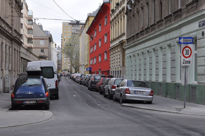 Podstawą walki z hałasem w Wiedniu jest zniechęcenie kierowców do jego generowania. Uspokojenie ruchu zapewnia to dwutorowo. Po pierwsze zniechęca do jazdy daną ulicą, a więc wyrzuca niechciany ruch przelotowy z wąskich uliczek. Po drugie, zmniejsza prędkość aut, a więc i hałas generowany toczeniem opon oraz opływem powietrza wokoło auta. Na zdjęciu strefa Tempo 30 - w Wiedniu to bardzo popularne rozwiązanie.