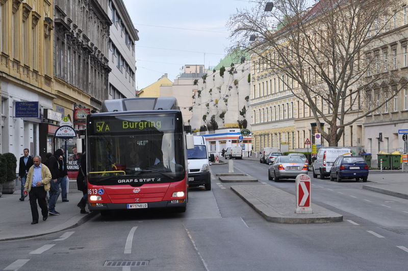 Szukając przystanku autobusowego na wcześniejszym zdjęciu nie szukajcie czasem zatoki. W Wiedniu raczej nie pozwala się omijać z rykiem silnika autobusu stojącego na przystanku [zobacz >>>].