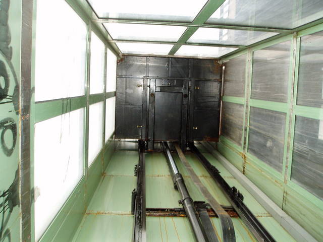 Dzięki wyłamanemu od dawna zamkowi bez problemu można za to wejść do szybu windy na dole i obejrzeć sobie jej podłogę od drugiej strony.