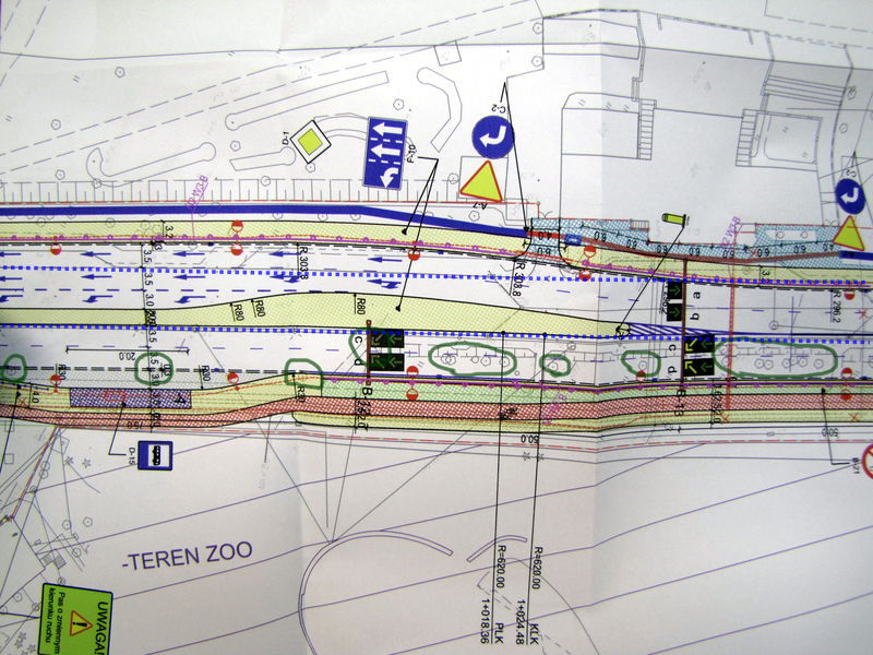 W efekcie na odcinku na północ od ul. Ratuszowej druga jezdnia projektowana jest prawie przy płocie ZOO. Na zielono zaznaczono przeznaczony do wycinki szpaler drzew między obecną jezdnią a ciągiem pieszo-rowerowym. Niebieska przerywana linia to obecna krawędź jezdni.