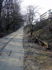 Z relacji żyjących jeszcze świadków minionej epoki dowiadujemy się, że w drugiej połowie ubiegłego wieku modne było hasło "Polak potrafi" i razem z Wisłostradą powstało na Bielanach i Żoliborzu całkiem sporo przylegających do niej ciągów spacerowo - rowerowych. I - mało tego - wykonano je z asfaltu (choć nie czerwonego, gdyż wtedy żaden drogowiec nie zaryzykowałby takiej profanacji koloru zarezerwowanego dla krawatów, flag i transparentów). Kto wie, czy nie były to pierwsze w mieście ścieżki ze znakami C-13, a z pewnością jedne z pierwszych. Niestety, władze zajęte głównie konserwowaniem betonu partyjnego pozostawiły te asfaltowe ścieżki na pastwę atmosfery i korzeni drzew. Jedne niszczały od słońca, wody i mrozu, inne przez 30 lat zasypywał piach z estakady lub ziemia i liście ze skarp, w efekcie czego zostały kompletnie zamaskowane i pogrzebane. Nasze interwencje zwracające uwagę na stan traktu przy Wisłostradzie i zaniedbania pielęgnacji ścieżek przyczyniły się do rozpoczęcia ich reanimacji.