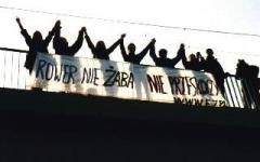 By zwrócić uwagę na notoryczne łamanie prawa przez Zarząd Dróg Miejskich, wywiesiliśmy na jednym z wiaduktów węzła Żaba okolicznościowy transparent.