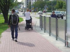 Typowa scena chwilę po odjeździe autobusu (widać go jeszcze za zakrętem przy Poligonowej) – cztery osoby przechodzą najkrótszą drogą w stronę sklepu po lewej stronie zdjęcia.