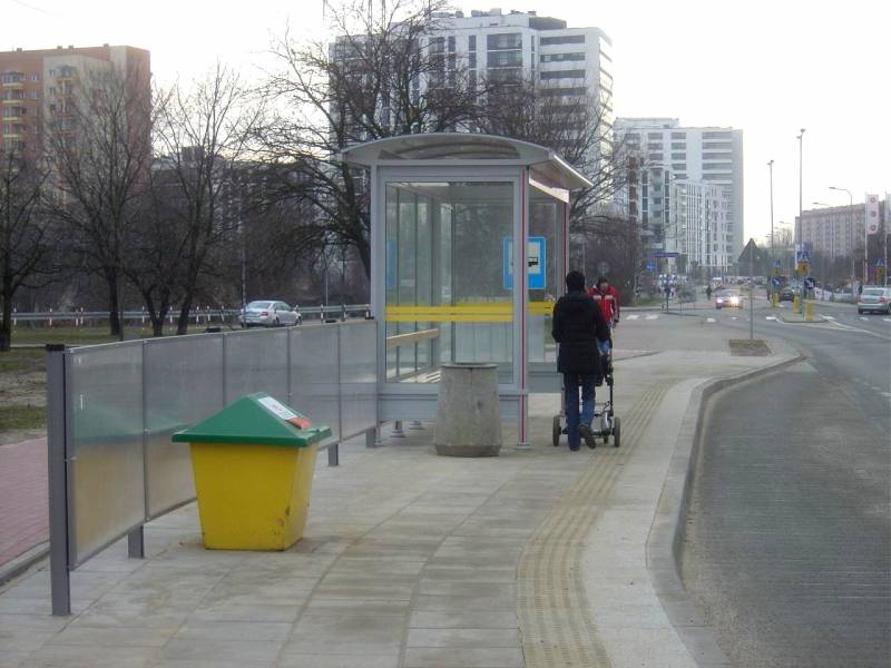 . Po zachodniej stronie ulicy między Poligonową a Kompasową obok wiaty dwie osoby mijają się z trudem.