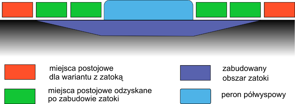 Przekształcenie zatoki w jej przeciwieństwo daje też jedną korzyść kierowcom - przed i za peronem można wyznaczyć miejsca postojowe, na ogół znacznie więcej niż w przypadku zatoki. Ilustruje to schematyczne (uproszczone) porównanie przystanku i parkowania przy nim w dwóch wersjach.