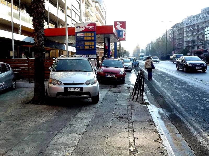 Na chodniku oprócz parkowania może pojawić się stacja benzynowa. Podobnie dotkliwych barier dla ruchu pieszego, czy wręcz spychających go na jezdnię w Atenach nie brakuje.