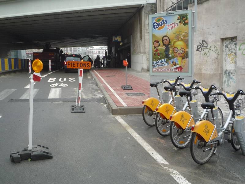 Peron jest gotów, ale prace jeszcze w toku, stąd elementy tymczasowej organizacji ruchu. Autobusy nie tylko uwolniono z zatoki, ale przyznano im jeszcze pas do spółki z cyklistami. Dzięki zdrowej redystrybucji przestrzeni znalazło się też dogodne miejsce na stację roweru publicznego – bez odbierania go pieszym.
