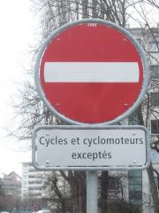 Zbliżenie oznakowania - spod zakazu wjazdu wyłączono rowery i motorowery.