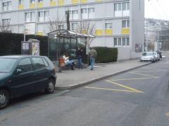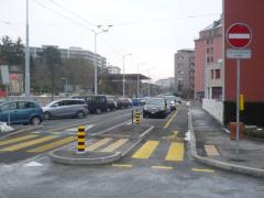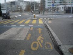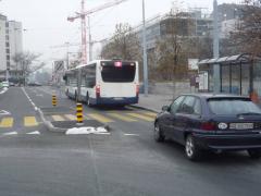 Od zachodniej strony ronda ulica jest dwukierunkowa i nawet posiada dwa pasy na zachód. Obszar zatrzymania autobusu przylega bezpośrednio do przejścia dla pieszych, co w połączeniu z fizycznym azylem powoduje wstrzymanie ruchu podczas postoju autobusu, a jednocześnie skraca drogę dojścia do jego drzwi.