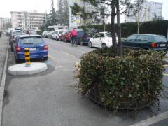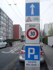 Dla pełności pokażmy jeszcze z bliska oznakowanie pionowe północnego wlotu Rue du Contrat-Social. Poniżej znaku drogi jednokierunkowej zamiast tabliczki ,,nie dotyczy'' Szwajcarzy umieszczają ostrzeżenie o dwukierunkowym ruchu rowerów. Dolny znak informuje, że parkowanie podlega tu ograniczeniom czasowym, spod których wyłączono mieszkańców dzielnicy Saint-Jean (winieta ,,J'').