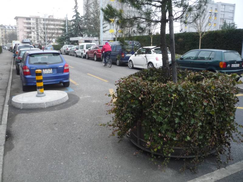 Wcześniej kontrapas przylega do pasa parkowania równoległego. Na pierwszym planie skutecznie zabezpieczony obszar przejścia kontrapasa w odcinek przy krawężniku. Na drugim - poglądowa lekcja prawidłowego zachowania rowerzysty jadącego zgodnie z kierunkiem ruchu na zasadach ogólnych, prawą stroną, a nie lewą po kontrapasie.
