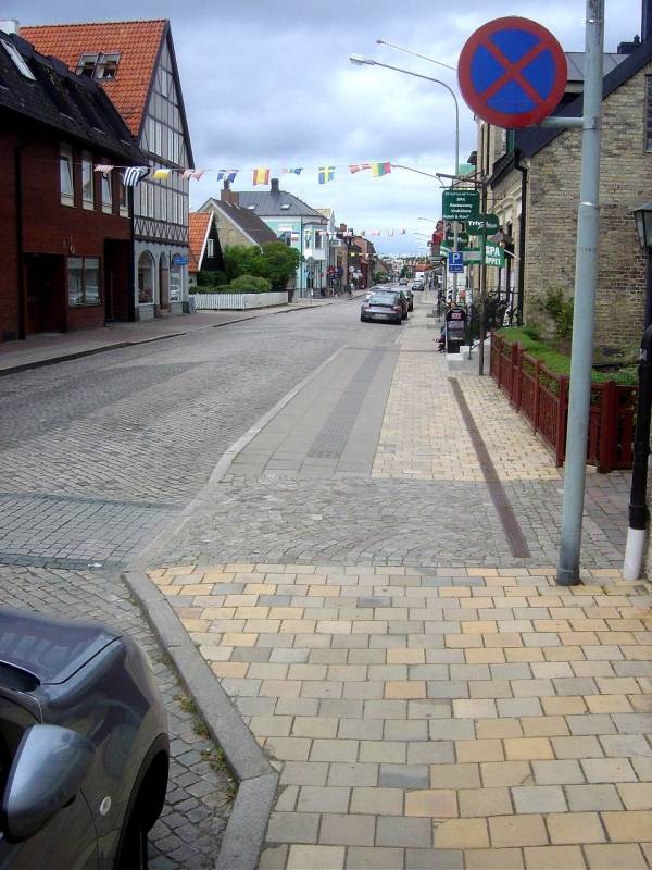 Widok z przeciwnej strony. Ciemny pas na chodniku to osłona rowka odwadniającego – peron podnoszący się ku osi jezdni sprzyja zalewaniu chodnika, trzeba o tym pomyśleć. W tle pas parkowania do 5 minut.