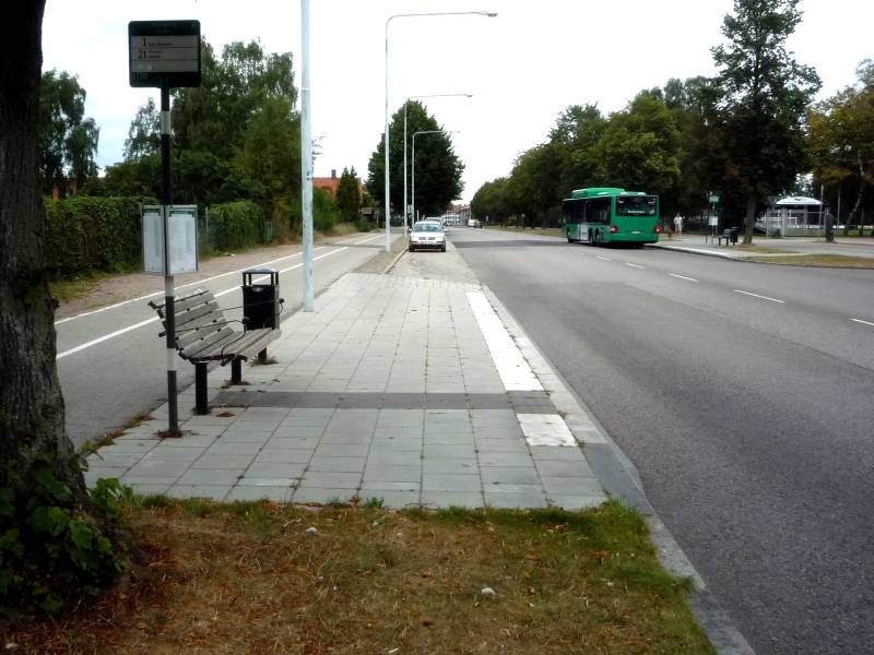 Obecnie część zatoki zabudowano uzyskując przestronny i wygodny peron. Uzupełnienie wyposażenia o ławkę i kosz na śmieci nie wymagało ingerencji w chodnik. A latarnia grzecznie odsunęła się na bok.