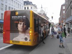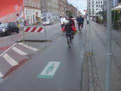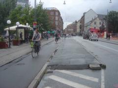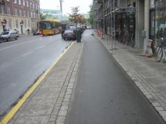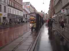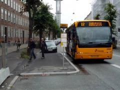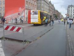 Na ul. Nørrebrogade ruch samochodów został mocno ograniczony [zobacz >>>], co znajduje odbicie w proporcjach podziału pasa drogowego między poszczególne grupy użytkowników. Ponieważ widoczna na zdjęciu trasa rowerowa należy do uprzywilejowanych tzw. zieloną falą (gwarancja ciągłej jazdy bez zatrzymań przy zachowaniu prędkości 20 km/h), postarano się, aby czekający na autobus nie blokowali ciągu rowerowego, a jednocześnie mogli usiąść pod dachem.