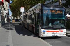 Z przystanku Thibaudière na Av. Jean Jaurès autobusy ruszają wprost na buspas, oczywiście z dopuszczonym ruchem rowerów (w tle osoba na rowerze korzystająca z tej możliwości).