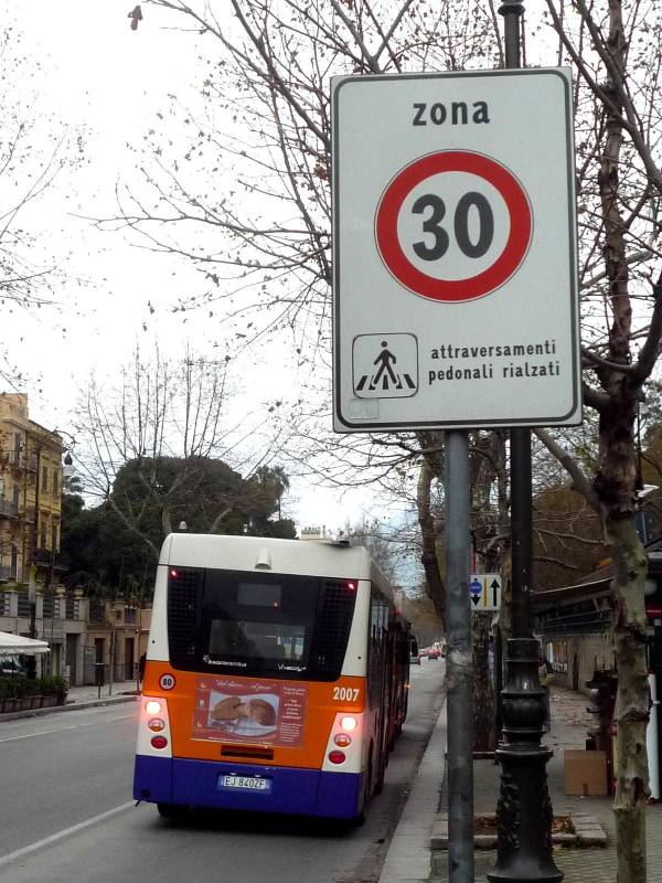 Na Via della Liberta obowiązuje ograniczenie prędkości - tempo 30. Napis attraversamenti pedonali rialzati to ostrzeżenie o wyniesionych przejściach dla pieszych.
