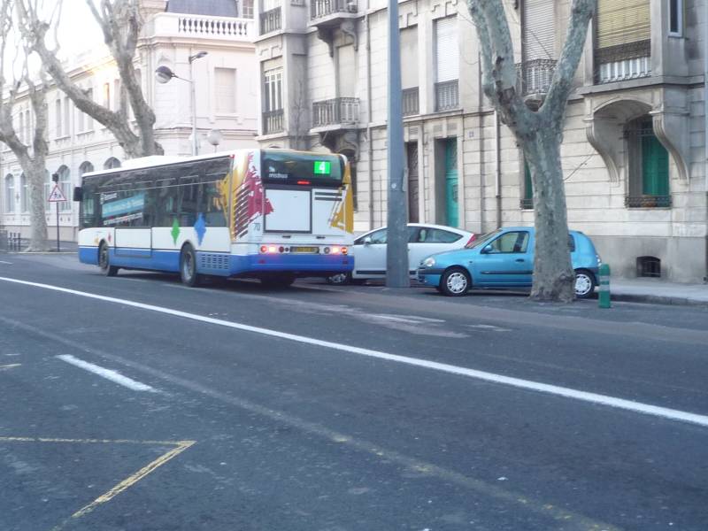 Boulevard des Pyrénées to ulica klasy zbiorczej o przekroju 2x2 pasy. W głębi autobus stojący na omawianym przystanku.