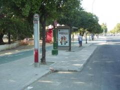Przy ulicy Ronda de Triana niemal wszystkie przystanki posiadają perony półwyspowe wysunięte na jezdnię.