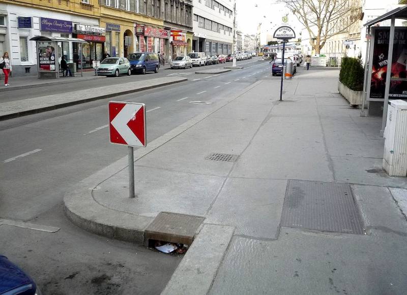 Oto odsłonięty w pełnej okazałości półwyspowy peron przystanku Grimmgasse na Sechshauser Straße. Linia segregacyjna równoległa do osi jezdni to oznakowanie poziome pasa dla rowerów, a nie podział na dwa pasy ruchu ogólnego. W głębi analogicznie zbudowany przystanek dla przeciwnego kierunku, na którym skupimy się za chwilę.