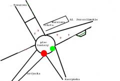 2. nadal pali się zielone światło dla zjeżdżających z placu w Jerozolimskie, mimo że nikt już ani nie znajduje się na pasach do jazdy na wprost w kierunku wschodnim na placu ani na nie nie wjeżdża,