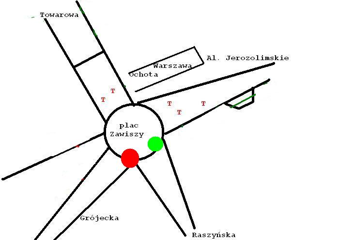 Proszę w szczególności o podanie średniej liczby samochodów zjeżdżających z placu Zawiszy w Al. Jerozolimskie w kierunku centrum od chwili zapalenia się czerwonego na wlocie ul. Grójeckiej na skrzyżowanie, a przed zapaleniem się czerwonego do jazdy na wprost na zjeździe ze skrzyżowania w Al. Jerozolimskie (rysunek schematyczny w załączniku).