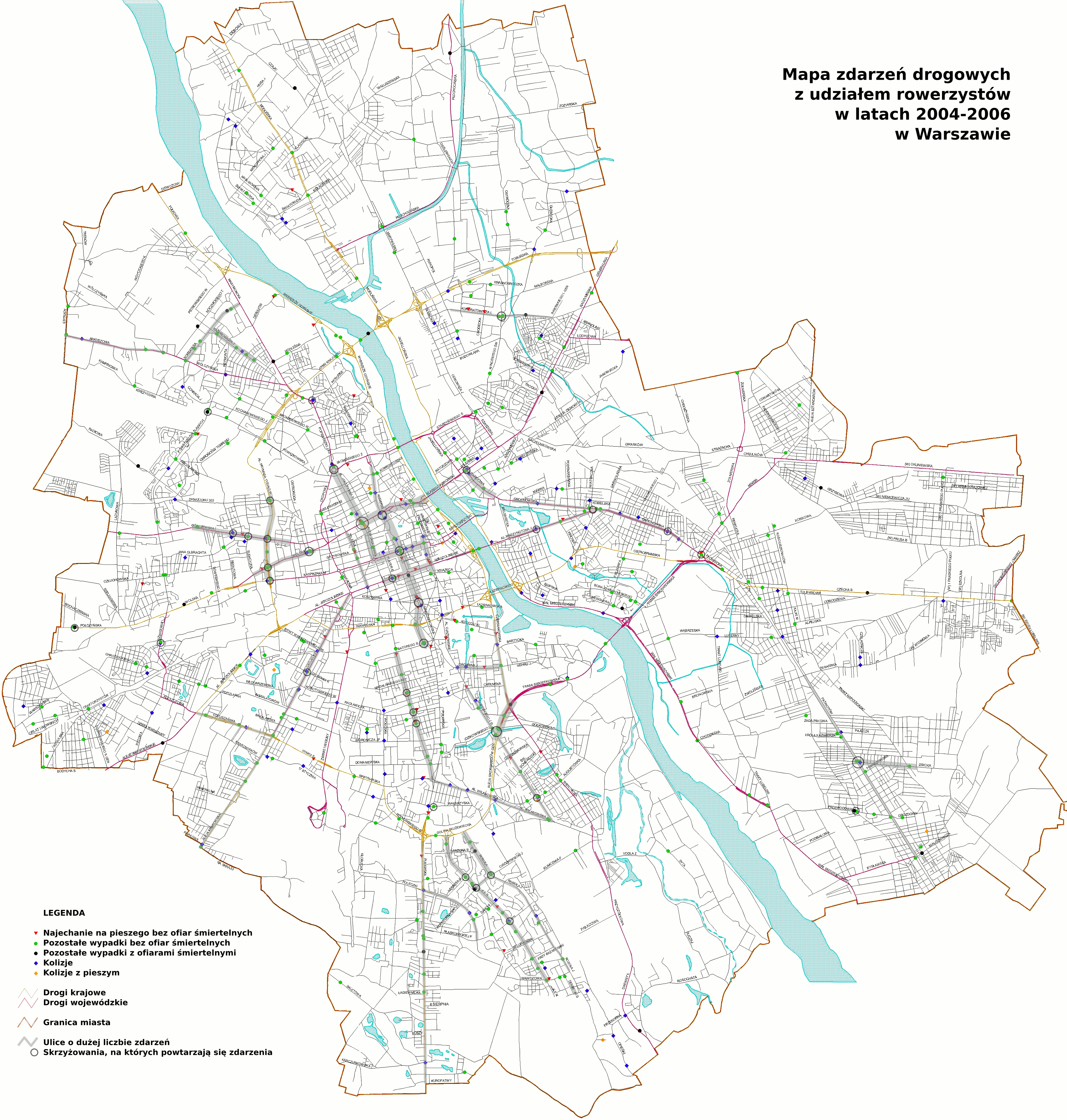 Mapa zdarzeń drogowych z udziałem rowerzystów w Warszawie 2004-2006: PNG, 885 kB