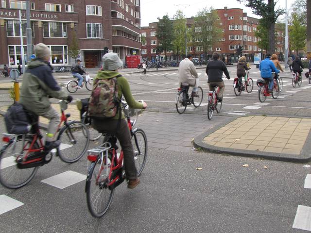 W Amsterdamie powitała nas Marjolein de Lange z organizacji Fietsersbond. Przemieszczając się na rowerach zobaczyliśmy różne typy dróg i skrzyżowań w mieście, dowiedzieliśmy się trochę o polityce transportowej Amsterdamu i niektórych działaniach Fietsersbond.