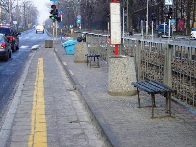 A oto wysepka przystanku urządzonego w taki sposób, jakby najważniejsze było wyeksponowanie wygrodzenia, koszy, ławeczek, ...