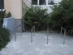 Dla porównania: znacznie bardziej skomplikowane stojaki po lewej stronie wejścia, do których da się przypiąć koło i ramę a nawet oprzeć o nie rower, ale o przypięciu tylnego koła można już tylko pomarzyć, a uszkodzić swój lub cudzy rower przy wstawianiu w ten stojak łatwo ze względu na małe odstępy między miejscami dla kolejnych rowerów.